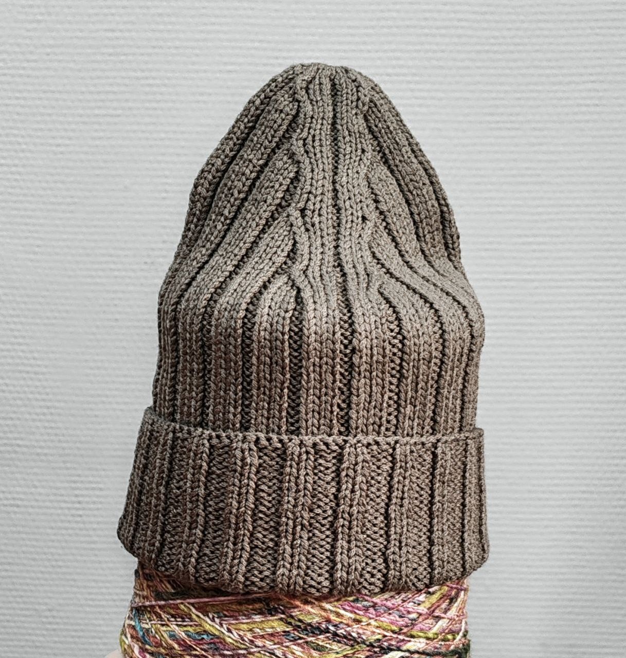 Шапка из шелка с хлопком, серо-оливкового цвета с необычной макушкой.